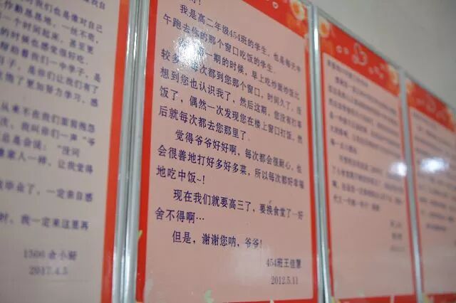 邵华文说,给食堂写信的传统始于多年前一次高考后,当年的高三学生写了一封感谢信贴在食堂墙上,下面是密密麻麻的签名。